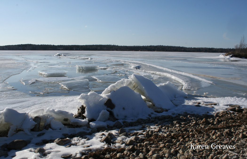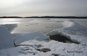 I’m not sure why this ridge was formed in the ice. Perhaps the receding water levels below the frozen surface caused the sheet to buckle. There’s no room for the ice to shift as it hasn’t started to pull away from the shore yet.
