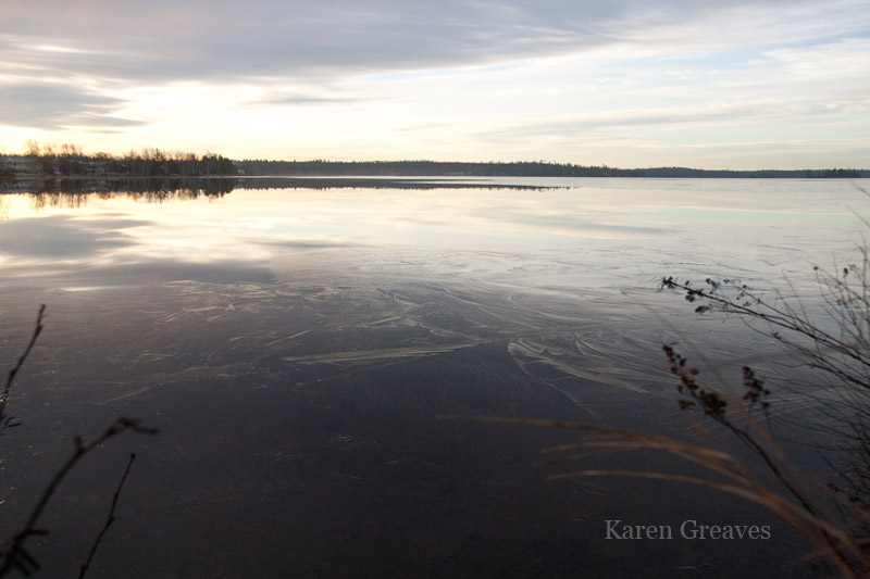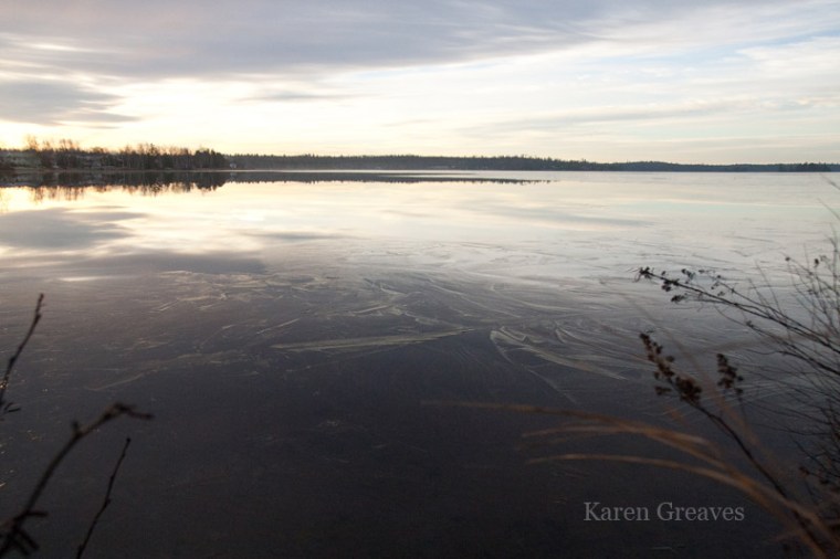We’re half way through November and Agimak Lake has not yet frozen over completely. After each calm night that the temperature drops below 0 C, we find beautiful brush strokes of ice. In the next few posts, I’ll share some close-ups of the intricate, icy designs.