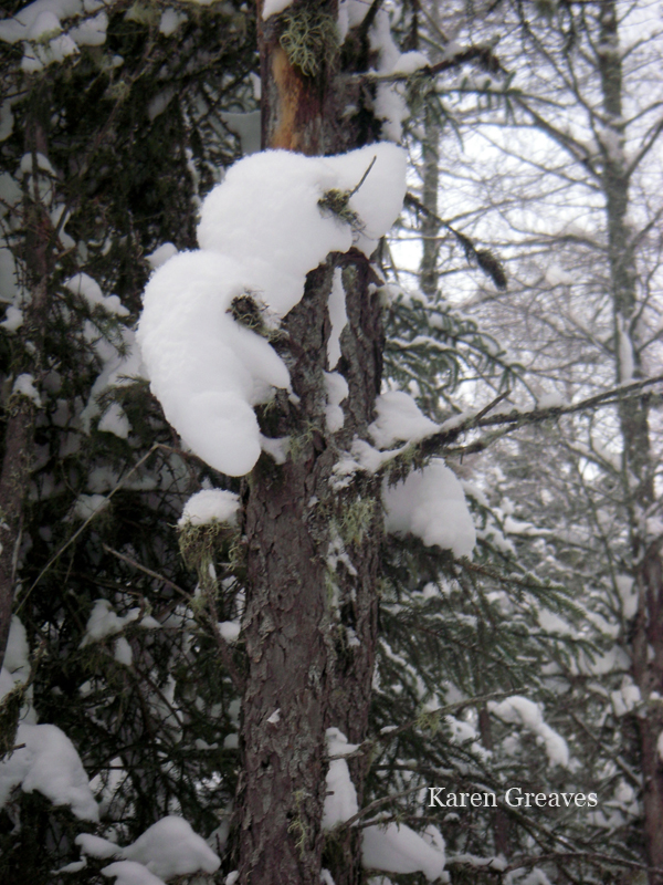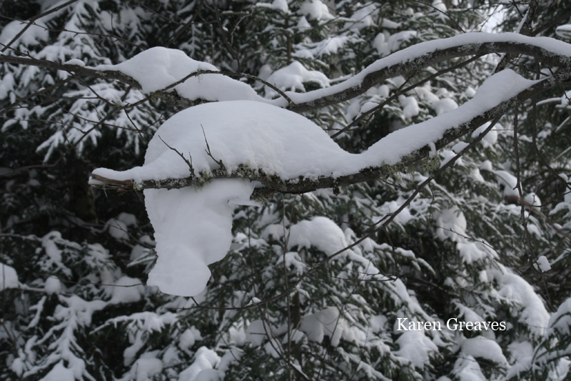 Over time snow piled on tree branches can take some pretty unusual shapes. Depending on the angle, they can look amazingly like something identifiable. Trying to figure out reminds me of playing the same game in summer with big white puffy clouds.