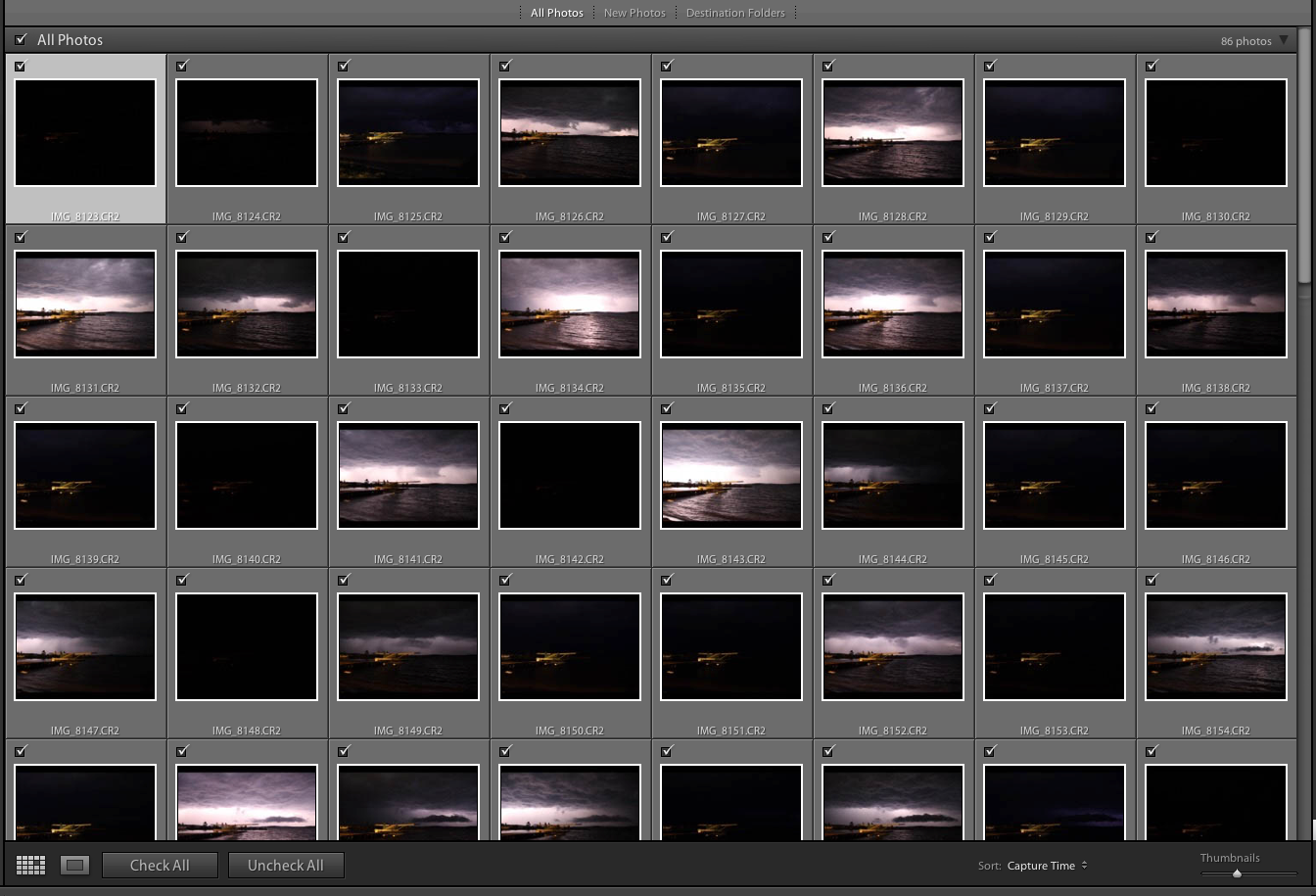 Anyway, there was a lot of lightning but most was sheet lightning. Even when I thought I was capturing a streak of lightning, the extreme brightness caused the lines blended into the overexposed sky. It was tricky to react like a trained game show contestant with a buzzer and at the same time calculate how long to leave the shutter open relative to how bright the flash of light was! But about the 65th try, I got one!