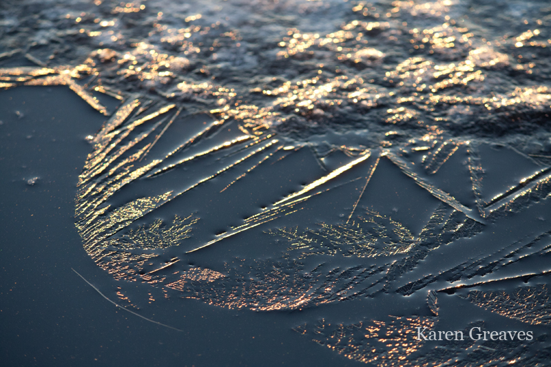 Monday night the still air slowly dipped below zero Celcius with the golden, setting sun. While catching shots of the day’s final rays of light on the texture of ice in the bay, spikes and feathers of ice grew before my eyes!