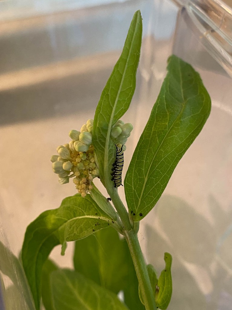 Having discovered a monarch caterpillar on our milkweed, we moved it inside with some milkweed not only to protect it but to observe its complete transformation to a butterfly and then release it.