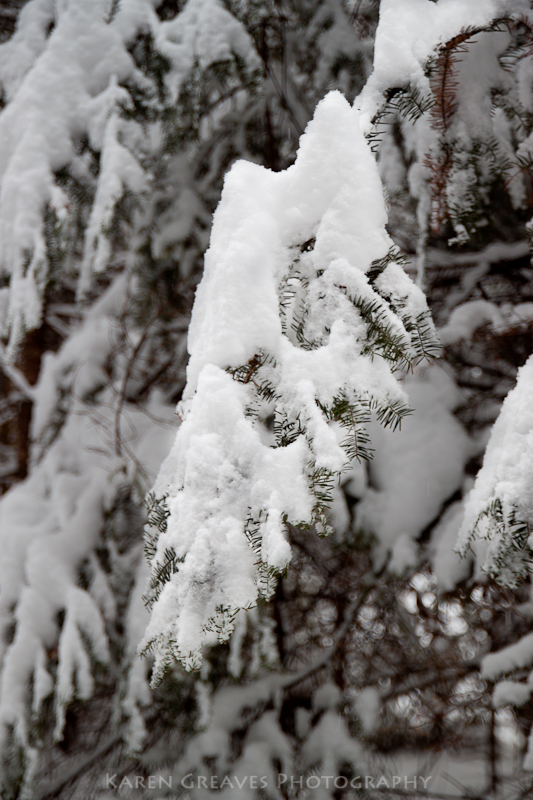 A dusting of snow on the bare branches of tamarack accentuate the horizontal.