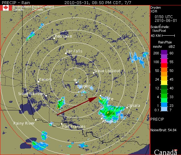 The red arrow indicates the direction of the storm’s movement relative to our location.