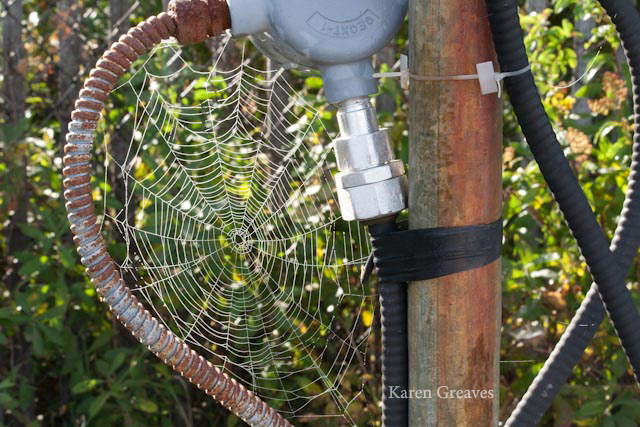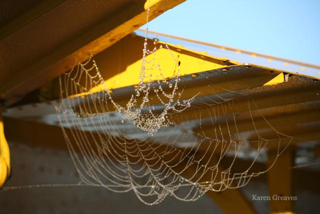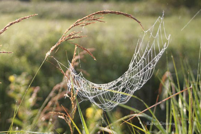 A cool damp morning as the mist is chased by the sun, tiny insect webs are revealed.
