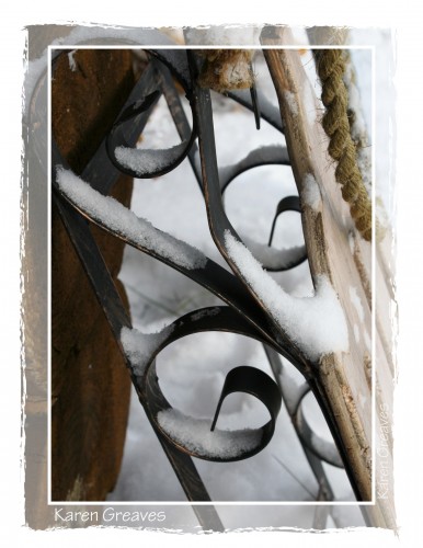 First snow fall on decorative sleigh by my front door.