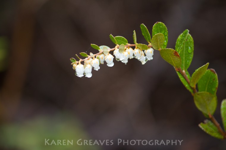 Leatherleaf appears as first forest flowers of spring in my backyard! These delicate little blossoms are very similar in shape to blueberry blossoms. They differ in their arrangement on the branch, however, strung like patio lights.