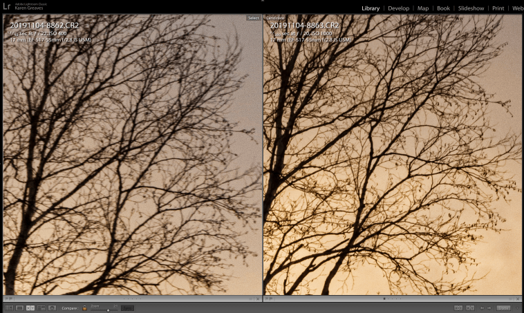 Here’s the close up comparison with camera settings from Lightroom .