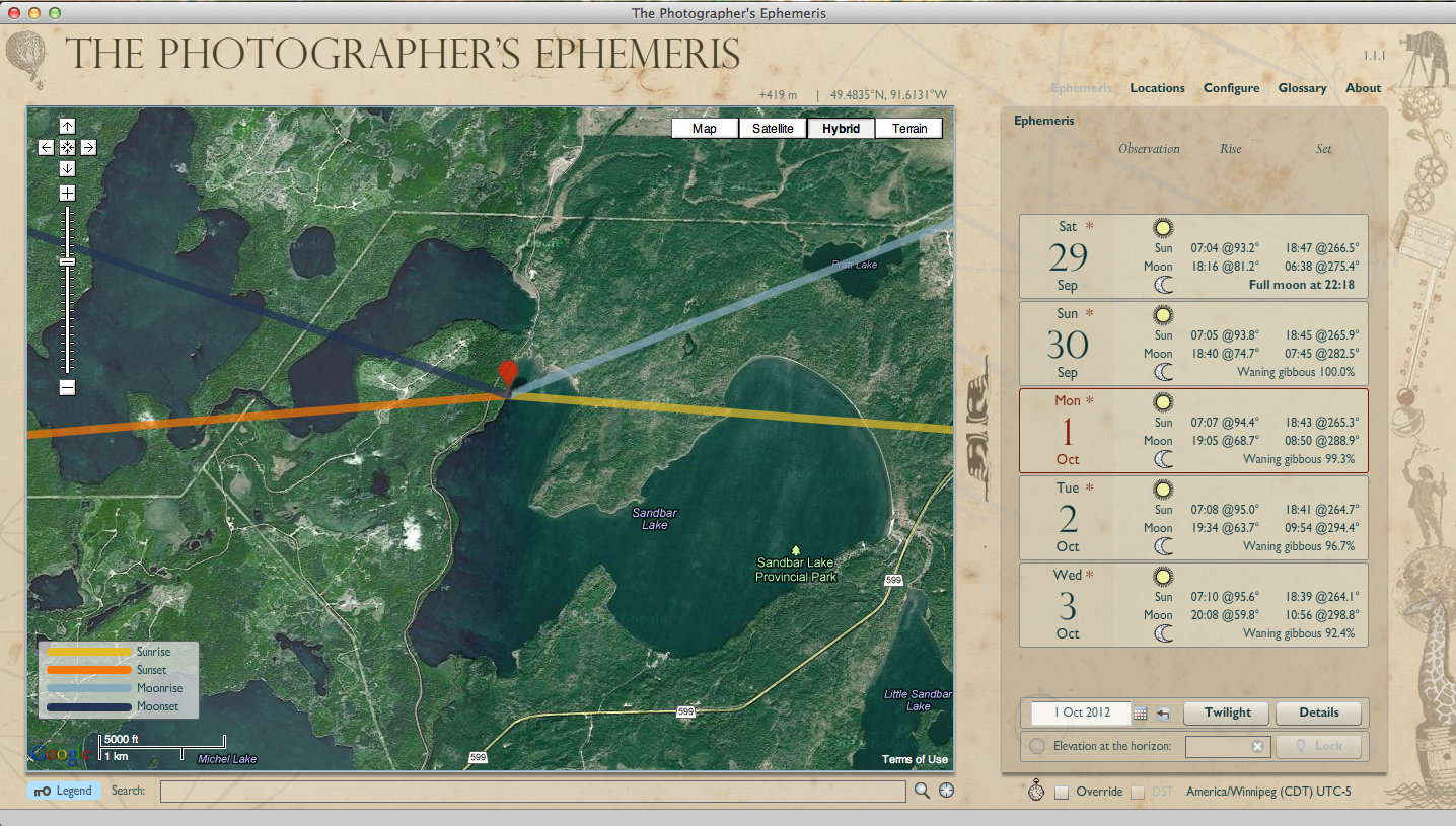 The best light for moon pictures is at dawn or dusk. The darker the sky the brighter the moon will appear and the more blown out in a picture. Sunrise and sunset data is readily available on weather site. Moon rise and set is a little harder to find. Where it will rise relative to where you are is even more difficult to determine. I’ve found an amazing application (free for desktop and $8.99 for smart phones) called The Photographer’s Ephermeris. This app allows you to pinpoint your location anywhere in the world for any day and it will give you the angle and time of both sun and moon rise and set. Here’s the screen shot from my desktop yesterday when I pinned the west shore of Sandbar Lake not far from my home.  I was hoping there would be an attractive foreground and not too distant lake shore for my shot.
