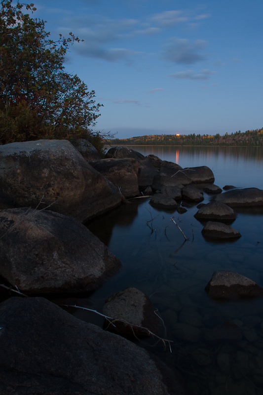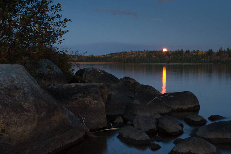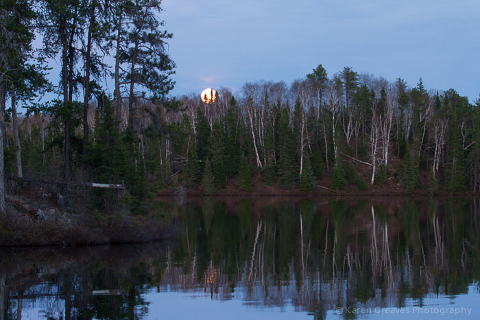 In my constant hunt for an exceptional moon rise shot and with my trusty The Photographer’s Ephemeris application (which I discussed in this post), I headed out to Raleigh Lake just west of Ignace to scout a location in advance of the May full moon. I was delighted to find a little island between shorelines. The moon was scheduled to rise 40 minutes before  sunset so I knew the moon wouldn’t be very bright in the still lit sky. Sure enough, it rose where I expected and was quite faint. I was still pleased with the angle and foreground/water. Here’s a resulting shot.
