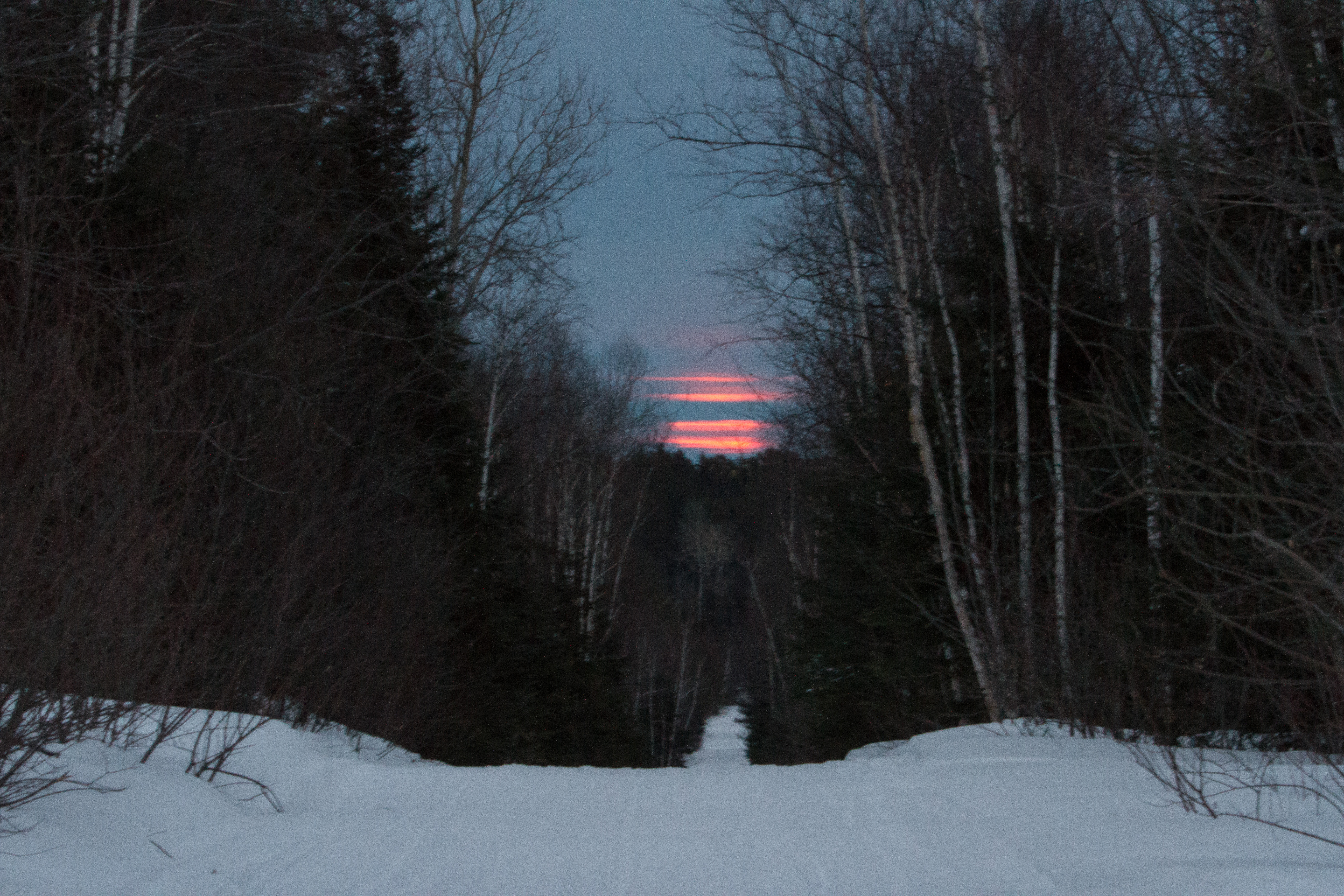 Lesson learned; sort of. I had 25 hours to gather my gear in preparation for the rise the next evening. According to my favourite photography app The Photographer’s Ephemeris, the moon was scheduled to rise an hour later which would make the sky and surroundings darker than the night before. The forecast was for cloud cover by sunset as another snow storm was moving in from the west. An hour before the scheduled moon rise, I headed out to locate a suitable angle for a shot assuming the gap between cloud and horizon would be sufficient. I had all but given up when I noticed a hint of colour.