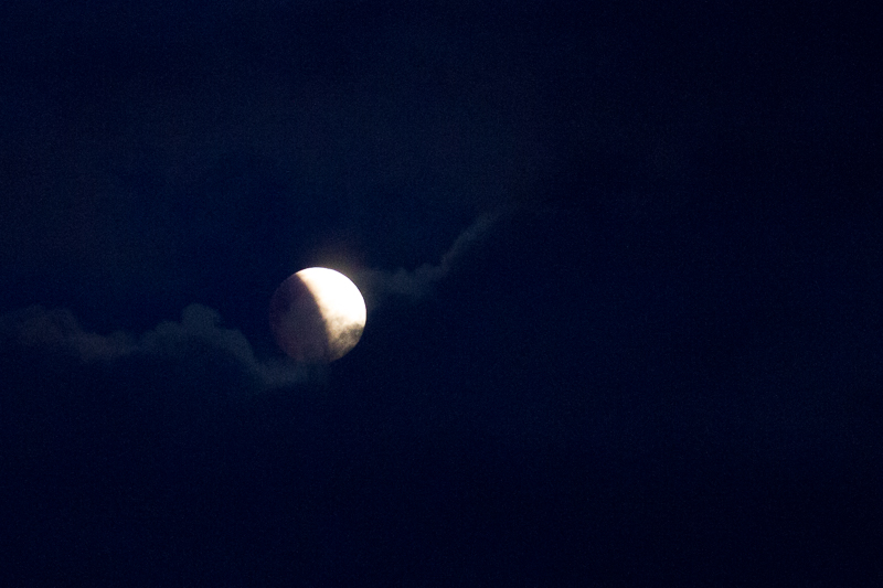 A quick glance out the window confirmed the event was actually visible and under way. I had set up the camera and tripod the previous night so I wouldn’t have to fumble with gear at the sleepy hour of 5:30 am. I stepped out on to the landing, pointed the camera at the moon and set about getting a shot. The air was a fresh -10C but reasonably calm; still chilly for one in a fuzzy robe and winter boots. After snapping a couple test shots, I headed back indoors, dressed more warmly and returned for more of the show.
