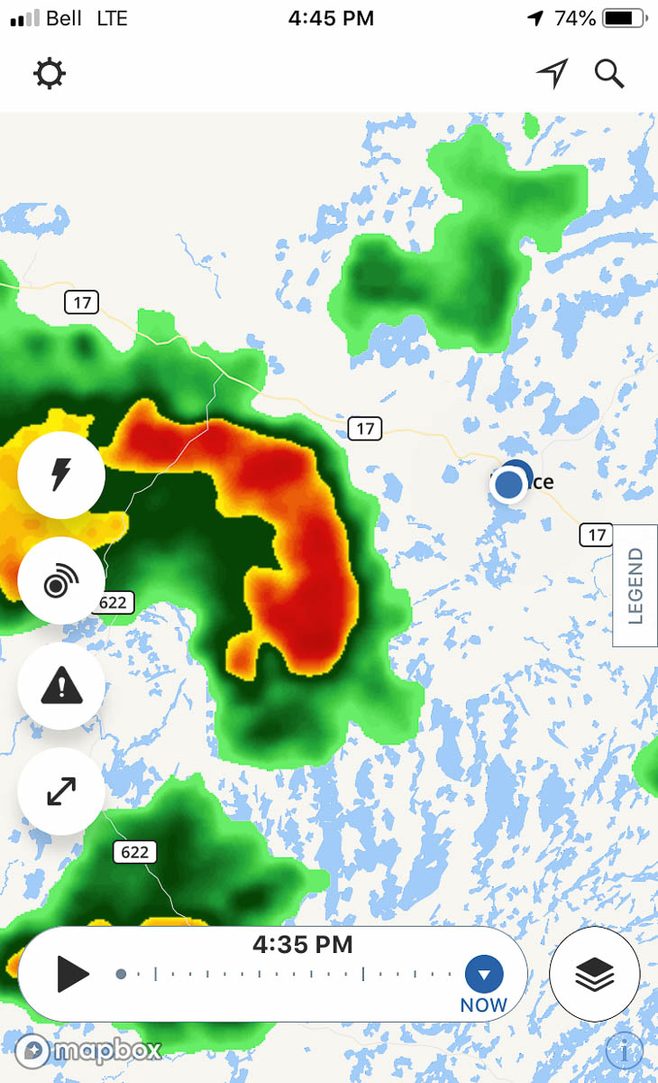 Living at the water’s edge offers us a large view and ‘front row seat’ to the weather systems in our area. We face east south east and systems typically move from west to east. Often we can see what’s coming from our front window. With all the technology in our palm (mobile phone), we have incredible weather stations at our fingertips to get specific details!