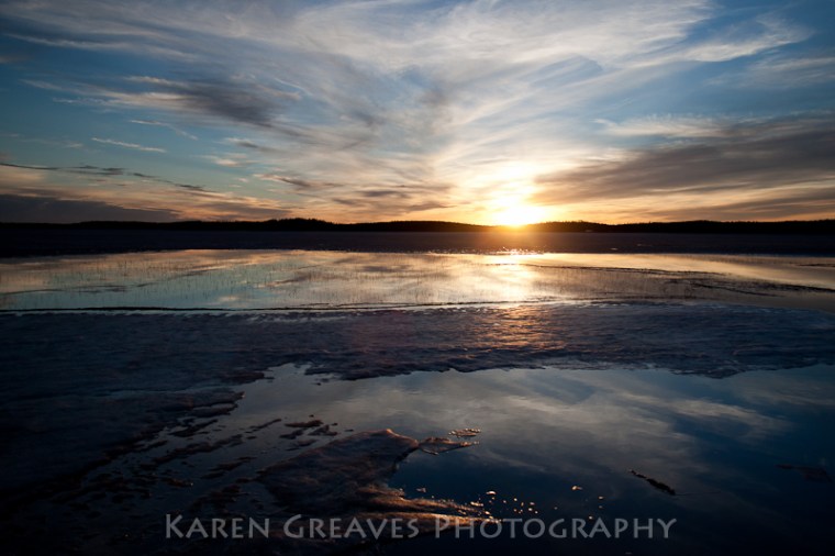 One of the things I look forward to most in spring is having the lake surface smooth like glass multiplying the beauty of our sunsets. Although the lake in front of our home is still frozen tight to the shore, where the creek runs out, there is always open water. The foreground in the image above is ice The area of open water looks larger than it is because the shadow of the far shore hides the fact that 95% of the lake is still frozen.